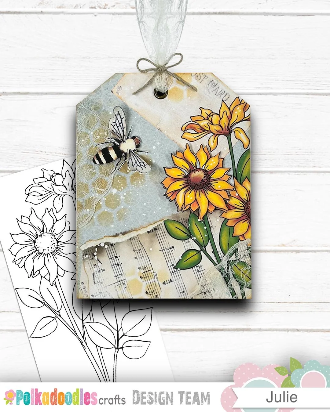 It’s late August here, and it’s sunflowers with bees buzzing - which fits in perfectly with my passion for creating journals and all that go with them. And so this tag came to be, using layers of papers from Polkadoodles Rose Bud Collection (this collection is a must) paired with a Blooms 3 floral image. Ink stenciling, bits of lace. and a touch of splatter created a backdrop for a popped up bee & floral blossom.
