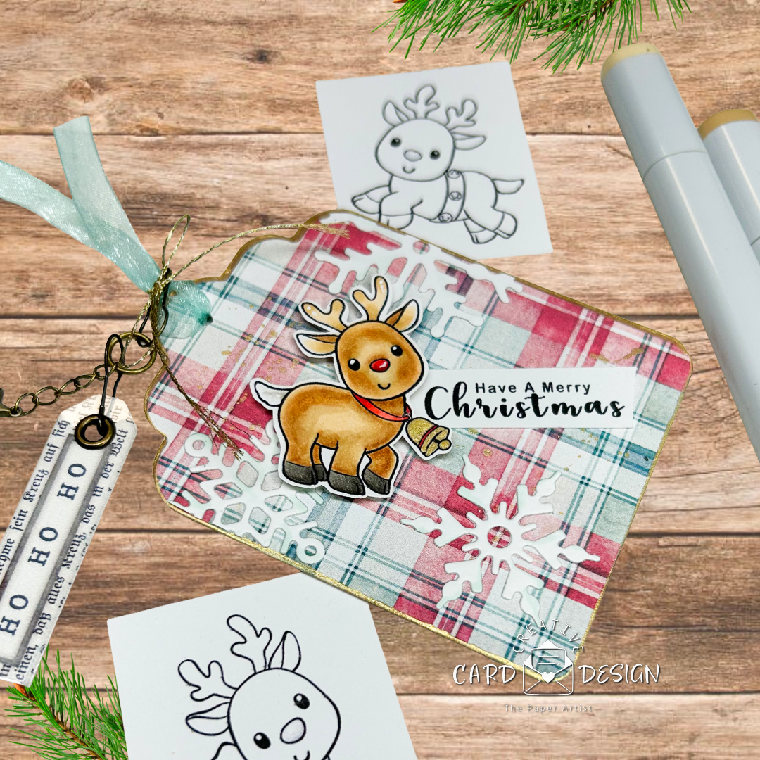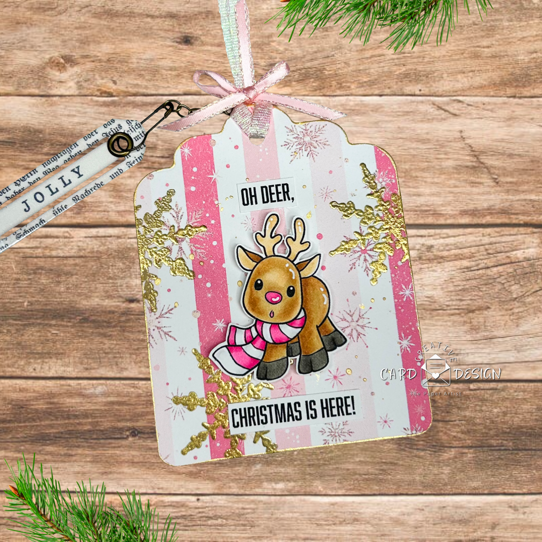 For the construction of these festive little tags, I kept things fun and textured. The patterned paper comes from Creative Fabrica’s digital collections, paired with snowflake dies that I dug out of my stash—they never disappoint. The gold details you see? That’s a snowflake stamp heat embossed to perfection, and a touch of metallic gold paint brushed around the edges to give each tag a rich, luminous finish. And because I can’t resist just a little extra something, I added mini handmade tag charms to each bow for that perfect finishing “umphh.”