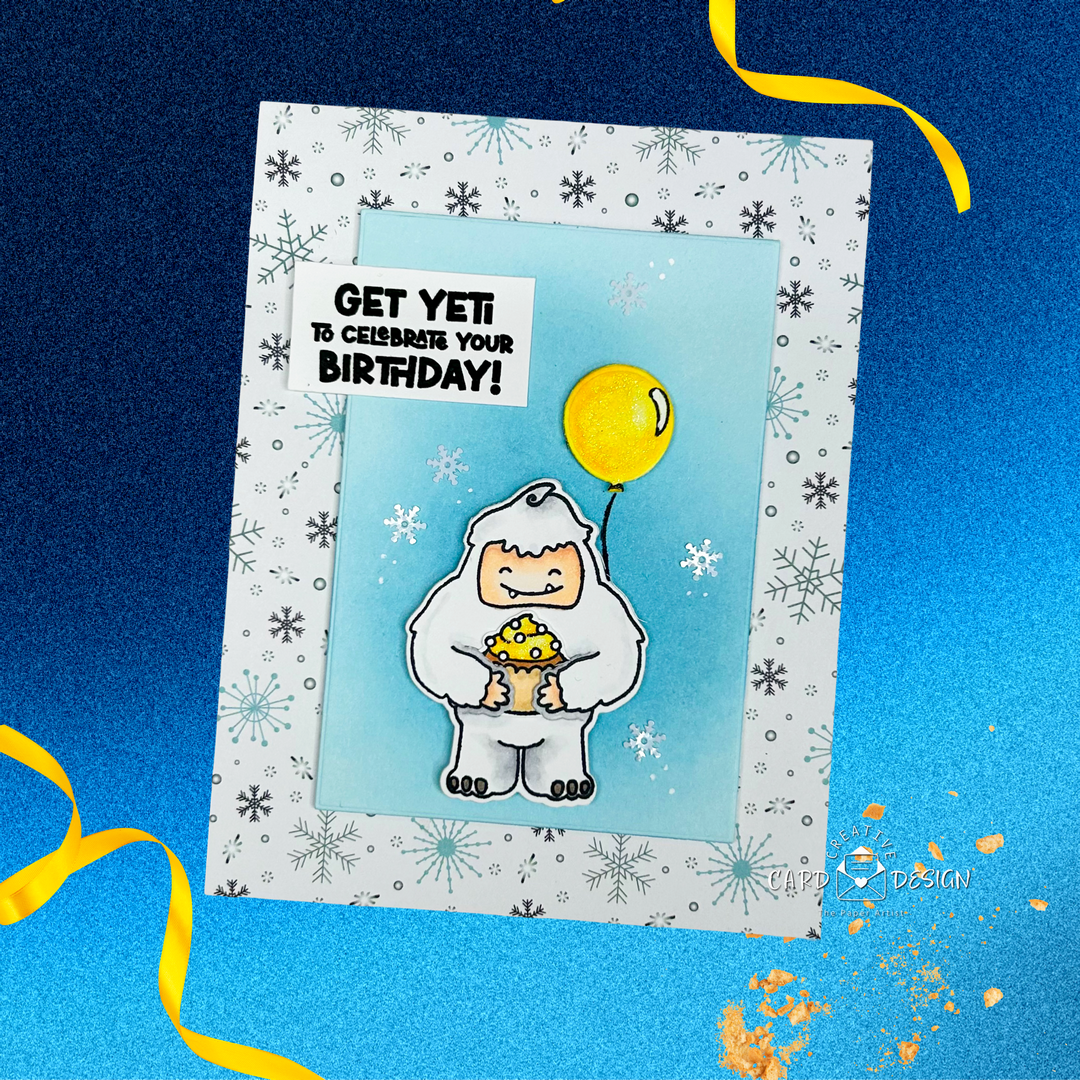 The Yeti himself was stamped, colored with Copic markers, and then die cut. One of my favorite things about this stamp set is that the Yeti die has tiny little slits in his hands, which means he can hold all kinds of things — balloons, cupcakes, or anything else in the set. Today he’s multitasking: birthday balloon in one hand, cupcake in the other. Honestly, same.