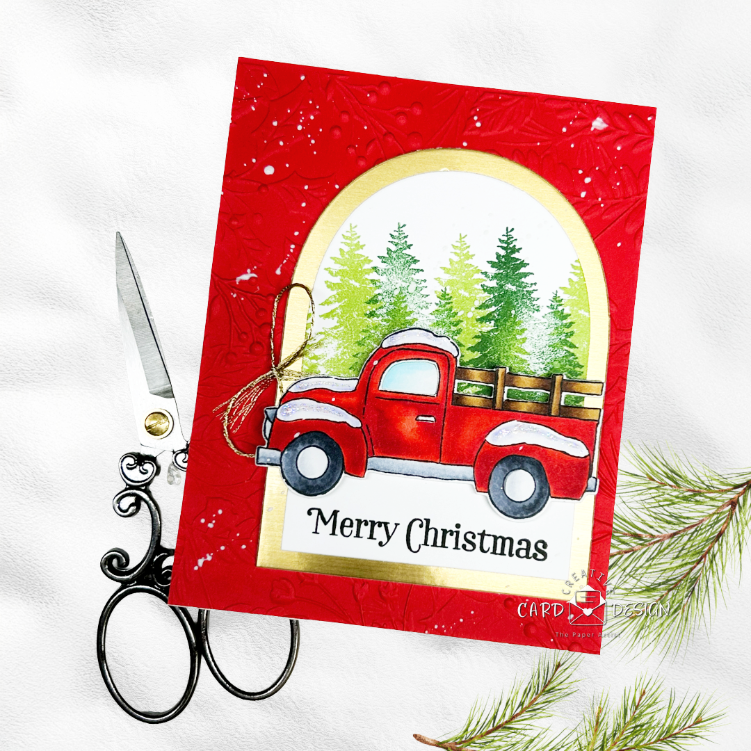 This card was created using a mix of stamped and die-cut elements, layered over a beautifully embossed background for extra texture. The arch design adds the perfect holiday framing for the iconic red truck and evergreen scene. Finished with a touch of metallic gold cardstock, twine detail, and a cheerful sentiment—simple supplies that come together to make one timeless Christmas classic!