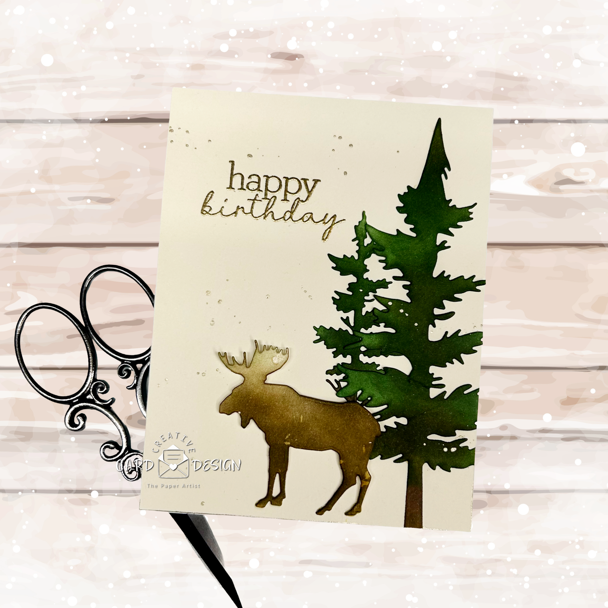 I decided to join the fun from the comfort of my craft desk with a rustic birthday card featuring a single, majestic moose surrounded by a few evergreen trees. Each piece was cut from white cardstock and brought to life with a bit of ink blending — soft browns and forest greens to capture that “fresh air and pine needles” feel. The vanilla-colored card base adds a touch of warmth, while a sprinkle of gold splatter gives it just enough shimmer to feel special — like the morning sun hitting frosted branches.