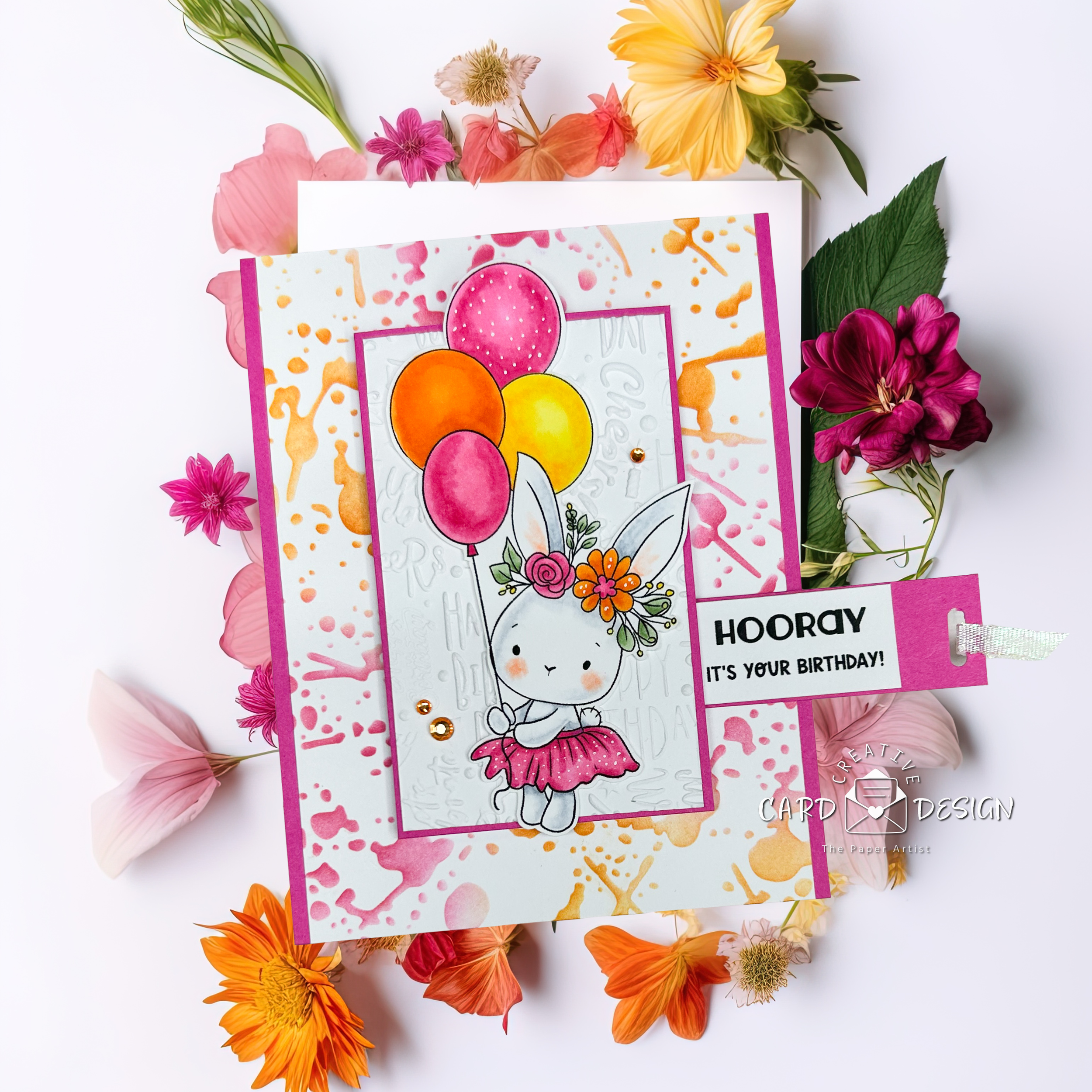 A gentle tug on the pretty ribbon reveals a hidden slider sentiment, because birthdays should always come with a little interactive magic.
